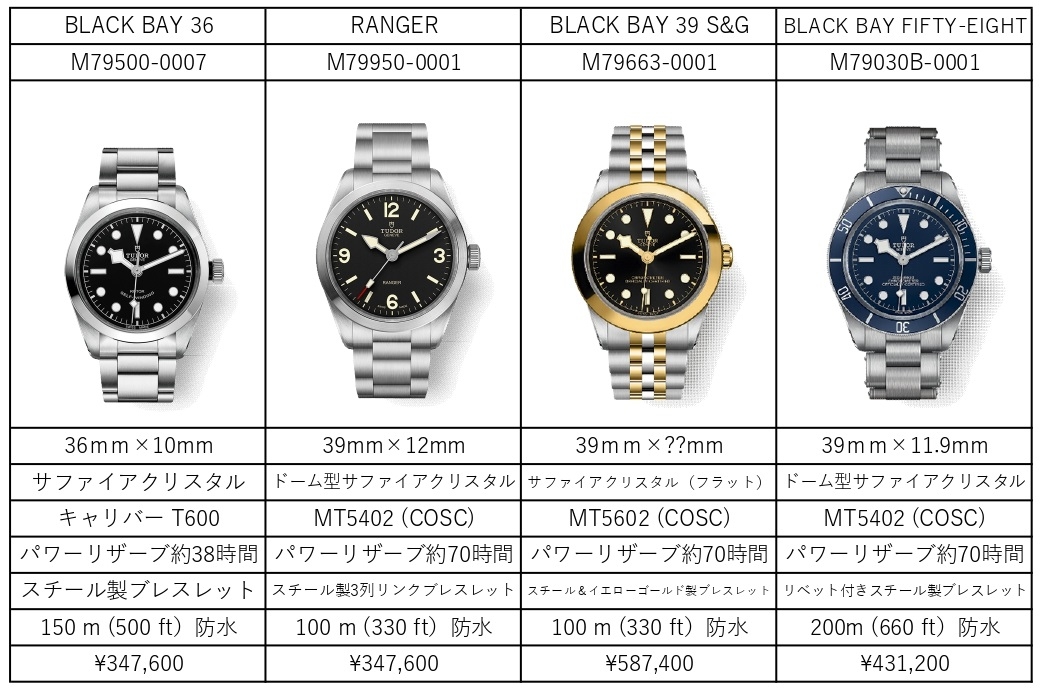 ご覧のように、新レンジャーはブラックベイ36と同価格であり、同じマニファクチャーキャリバーを積んだ他モデルと比べ最廉価となっています。