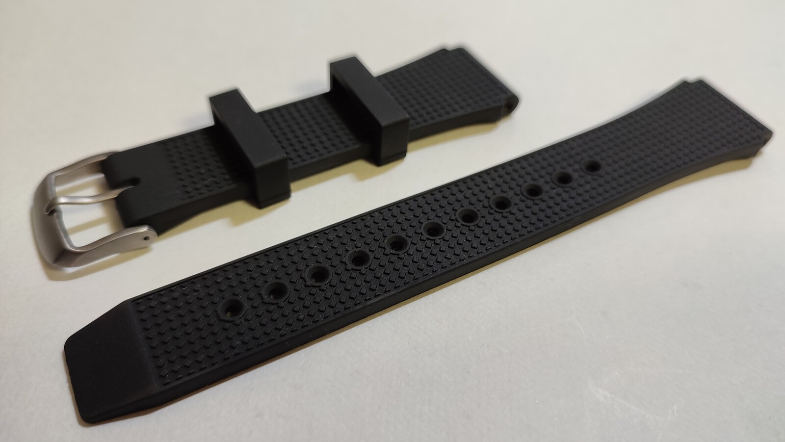 ウレタンベルトとのことですが、シリコンのようにサラサラ・グニャグニャで装着感は悪くないですし、ばね棒を通す穴には金属管がインサートされている点は高評価です。