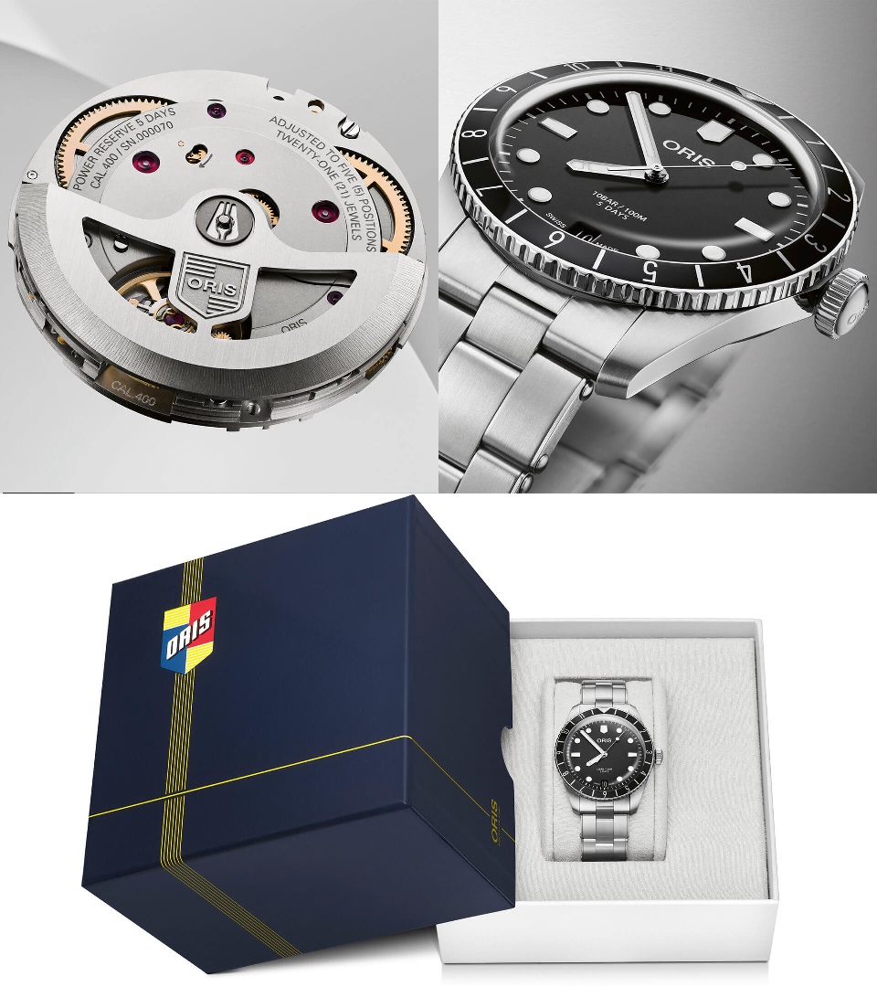 1本目はオリスの看板商品ダイバーズ65にパワーリザーブ120時間、10年メンテフリーのcal.400を搭載したモデルです。