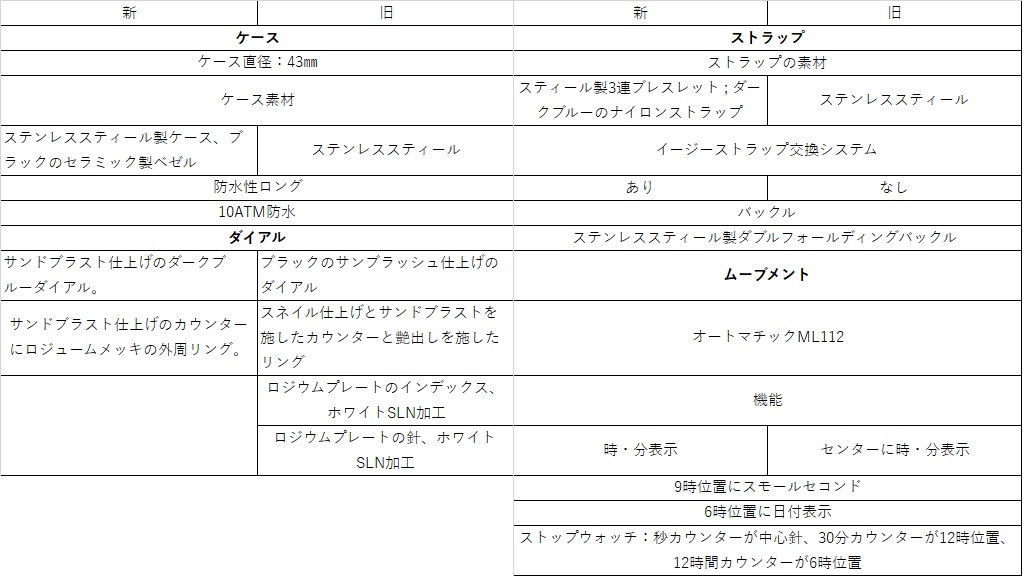 新旧のスペックを比較してみると外装のセラミックベゼル、イージストラップ交換システムと交換用ナイロンストラップ、曜日表示の追加が主な変更点となります。