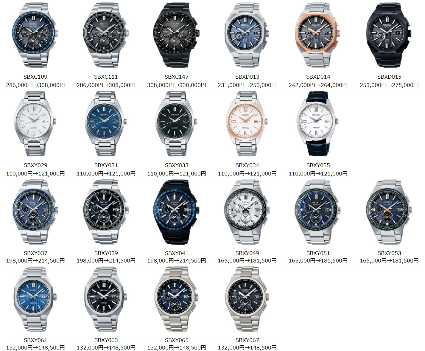 アストロンは電波モデルのベーシックラインを中心に、やはり10%ほど値上げされています。
