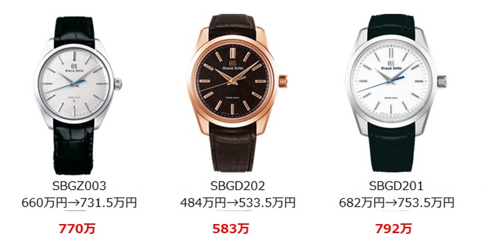 しかし、スプリングドライブSBGA467(60.5万円)、9FクオーツSBGP003(41.8万円)、9SキャリバーSBGR309(58.3万円)いずれも黒文字盤、SBGR307(58.3万円)白文字盤が値段据え置きだったのは、セイコーが消費者に配慮してくれたこと以外の何物でもないでしょう。