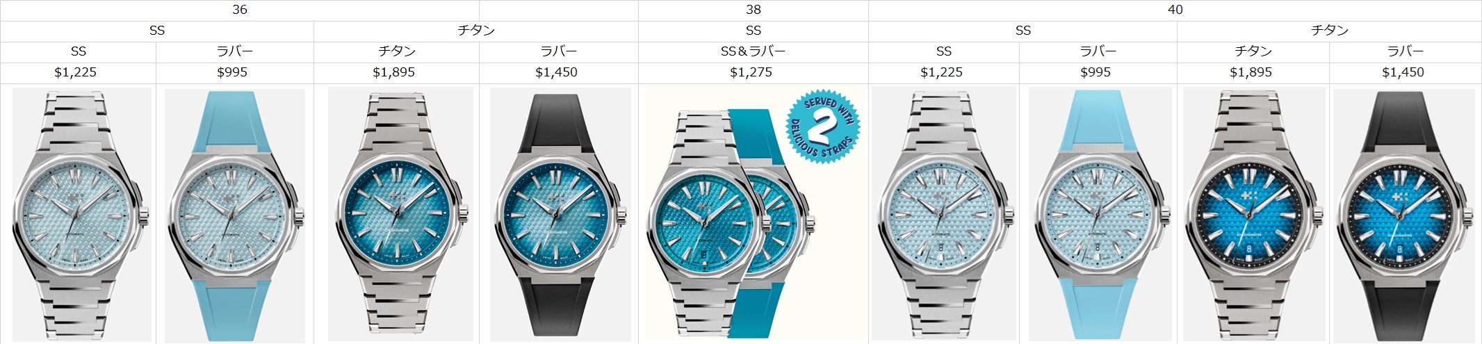 おそらく、38mmがレギュラーモデルとして発売された暁には、36mmモデル・40mmモデル同様、ラバーベルトは995$、SSブレスは1225$での発売となるでしょう。