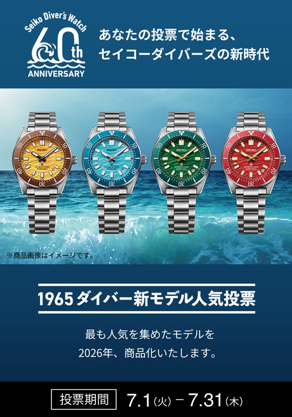 そんな中、セイコーからダイバーズウォッチ60周年を記念して、1965ダイバーの人気投票が行われることが発表されました。(投票期間2025年7月1日~2025年7月31日)