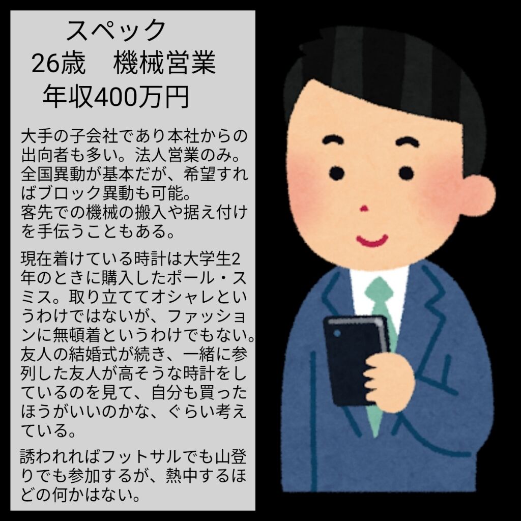 プライベートはアウトドアともインドアとも言えません。また、ある程度オシャレにも興味があるようなので、どんな服装にも合わせやすいものを選んだほうが良いでしょう。