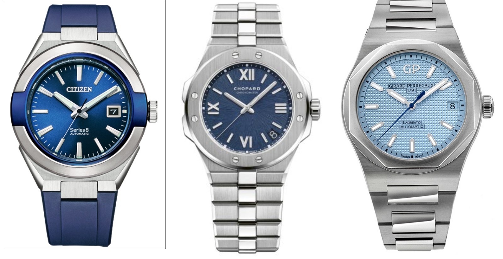 ④はダイヤモンドもセッティングされておらず、クォーツ搭載の最廉価モデルですが、見てのとおり文字盤がタマランです。一応、スペック的には「ブルー」となっていて、モデル解説では「紺碧」とも形容されていますが、やっぱり「アイスブルー」という表現がしっくりきますね。